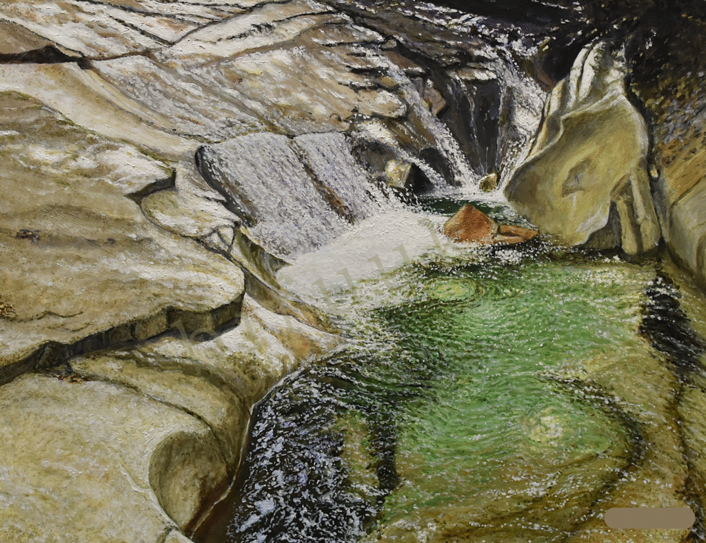 今回は透明な水を描きたくて藤河内渓谷の千枚平にある(多分名前の無い)小さな滝つぼをモチーフにしました。