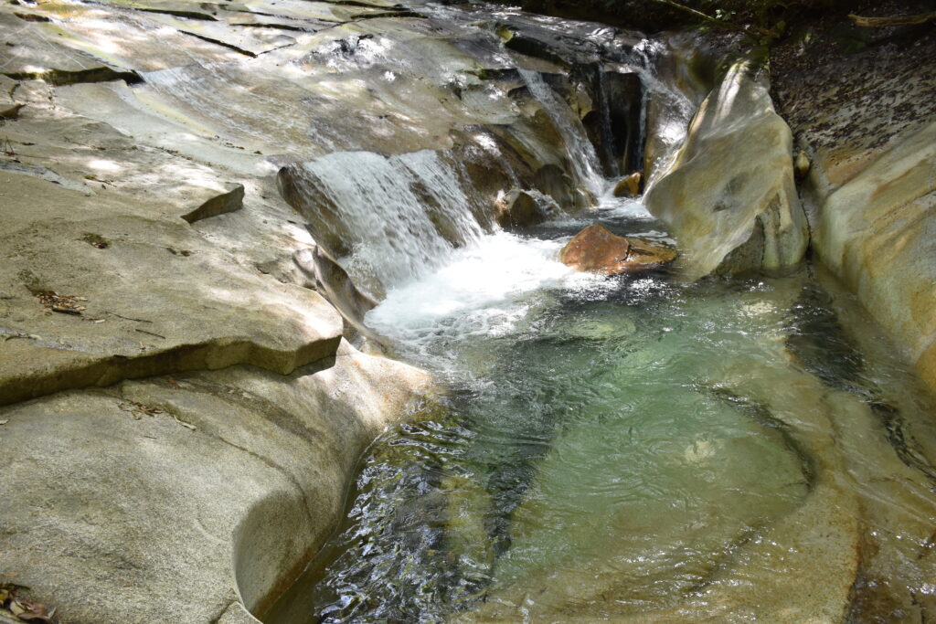 上の写真の案内板の①(千枚平)の少し下流にその滝つぼがあります。